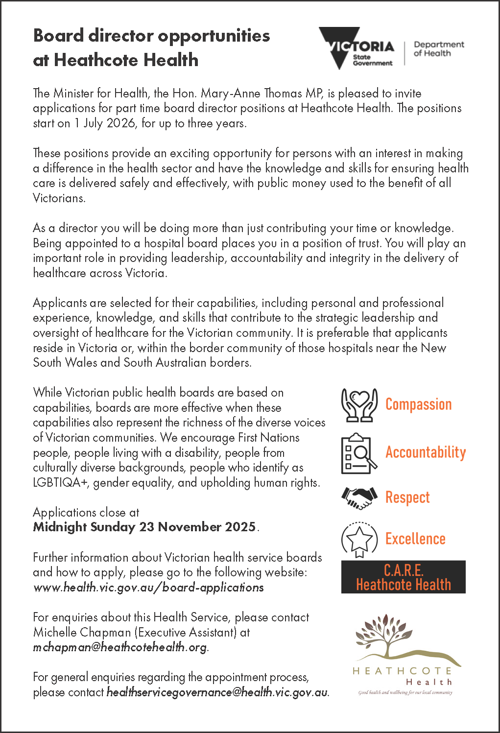 Board Director Opportunity – Heathcote Health (Commencing July 2026)